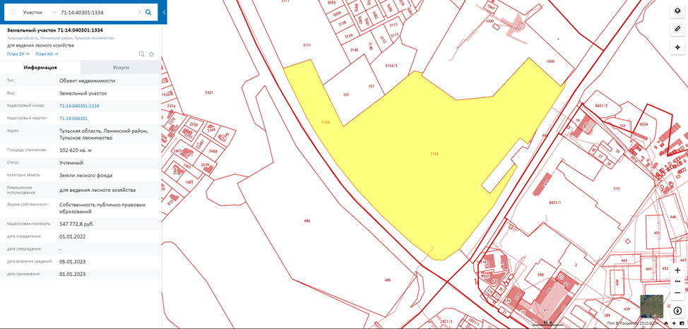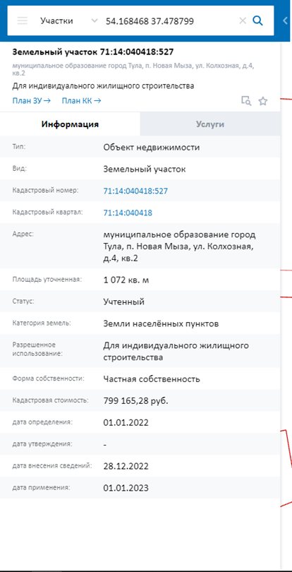 На карте можно узнать информацию, касаемо земельного участка: