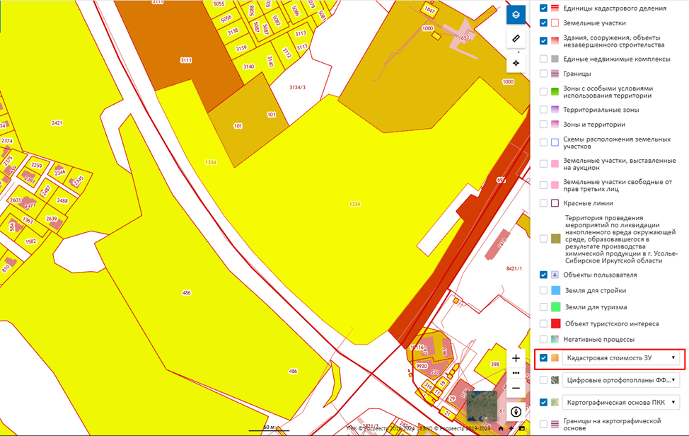 Чтобы на ПКК найти свободный участок для застройки или проверить тот, который вам предлагают купить/арендовать, воспользуйтесь дополнительными инструментами поиска. Их можно найти в меню в правом верхнем углу карты. Выберите там раздел «Слои» и пролистайте меню вниз. Если вы хотите ориентироваться на цену, выбирайте пункт «Кадастровая стоимость ЗУ». Тогда на Публичной кадастровой карте все земельные участки будут подсвечиваться разными цветами. Чем они дешевле, тем ближе их оттенок к желтому. Самые дорогие участки — темно-коричневые.