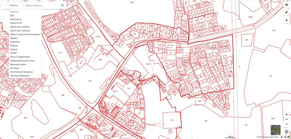 Введите в строку поиска кадастровый номер или адрес объекта. Если у вас нет этих данных, увеличьте масштаб карты на главной странице сайта, чтобы найти интересующий объект вручную. В строке поиска также доступен выпадающий список, где вы можете уточнить категорию поиска: выберите «участки», «ОКС» (объекты капитального строительства), «комплексы», «районы» или «адреса».