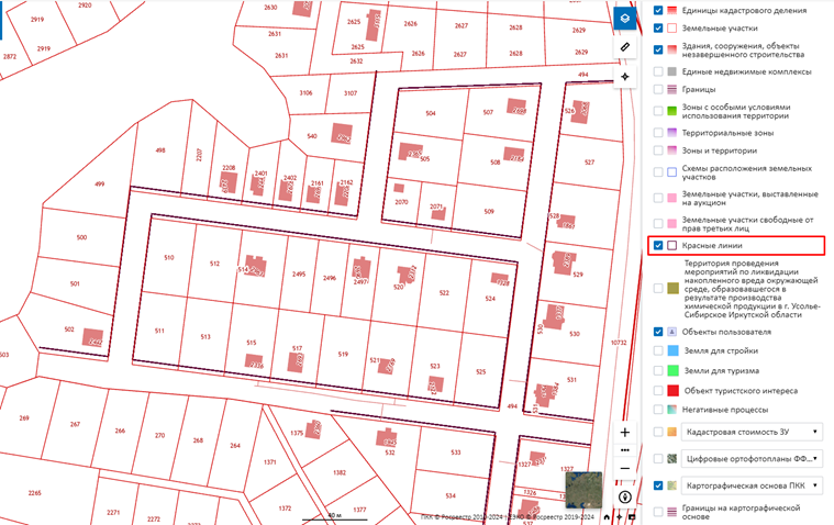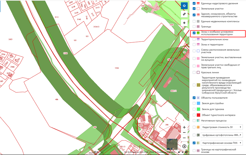 -Ограничения. Они бывают разными. Сюда относятся не только обременения, которые могут быть наложены на участок: ипотека, арест, аренда. Но и зоны с особыми условиями использования – проверить можно через раздел ЗОУИТ в правом углу карты. На карте ЗОУИТ обозначается зеленой полосой.